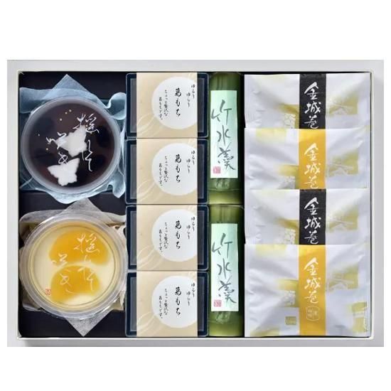 内容:葛もち3個、涼華(二層ゼリー)各1個、細竹水羊羹2本、金城巻各2個
